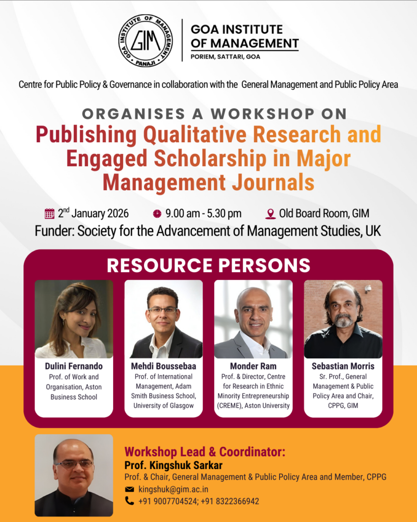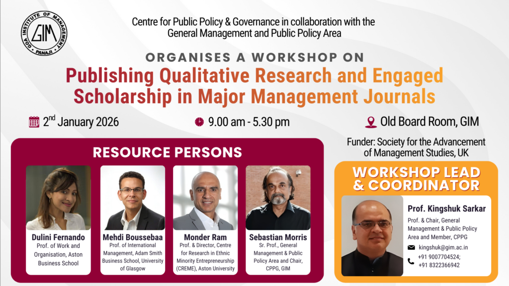 Workshop on ‘Publishing Qualitative Research and Engaged Scholarship in Major Management Journals’ that will take place at the Goa Institute of Management, Goa, India on Friday, 2nd January 2026. The workshop is being funded by the Society for the Advancement of Management Studies, UK. The key resource persons for this workshop are: Professors Dulini Fernando, Mehdi Boussebaa and Monder Ram.